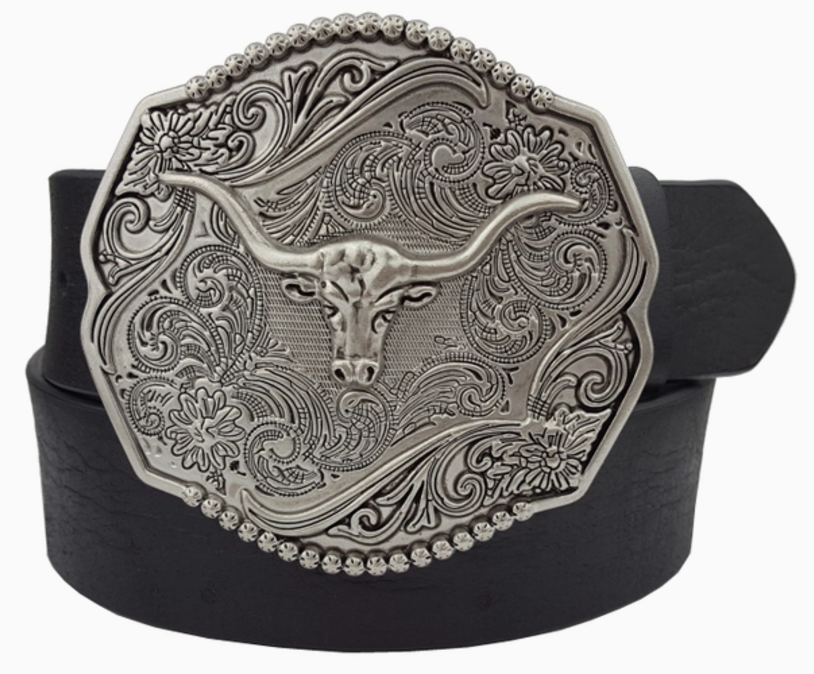 Western riem met zilvere buckle longhorn zwart